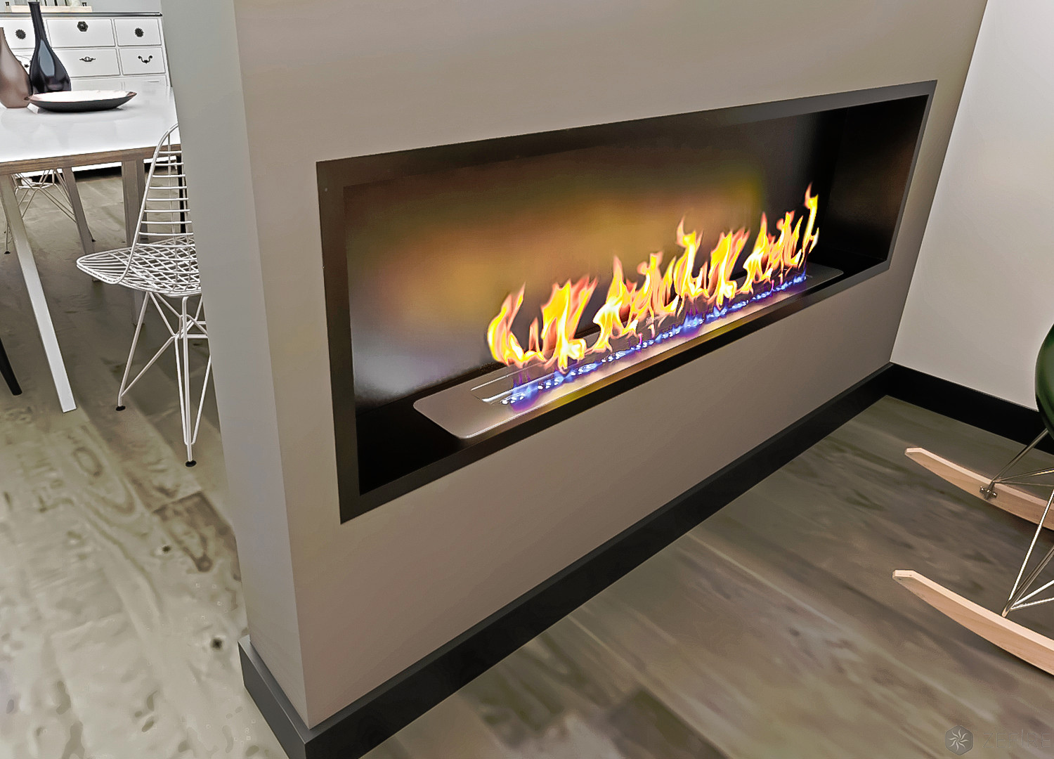 Встраиваемый биокамин Fest 1600 от российского бренда Estetic Flame – это самый короткий путь к мечте о домашнем очаге с живым пламенем. Установить такой огненный декор можно в любой квартире, даже если вы живете на первом этаже и дымохода в здании нет. Заказывать проект и согласовывать установку камина с пожарными службами и другими инстанциями не нужно.Биокамин работает на жидком экологичном топливе. Состав на спиртовой основе при сгорании не выделяет дыма, гари и копоти. Поэтому устройство не привязано к коммуникациям и его можно инсталлировать в любую ненесущую конструкцию. В том числе – в короб из гипсокартона или мебель из МДФ. Для теплоизоляции в последнем случае достаточно минеральной ваты и фольги.